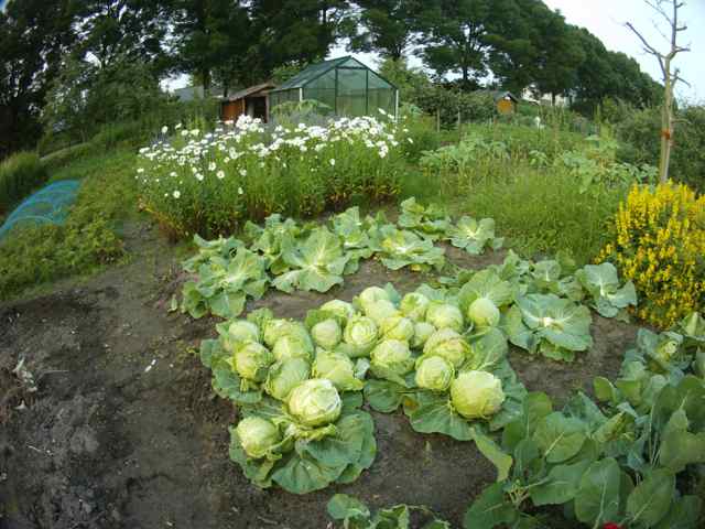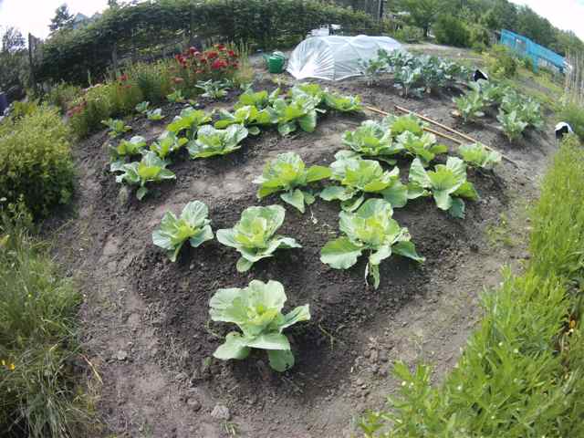 Zo rond Mei (ik hou altijd de IJsheiligen als kalender aan) kunnen de plantjes, die dan al behoorlijk fors zijn, de volle grond in. Om te voorkomen dat de duiven alles opvreten doe ik er in het begin nog even een plastiektunnel overheen zetten. Dat helpt ook goed bij een vorst-verrassing. Ik plant altijd meer kool dan ik voor de zuurkool nodig heb, want het komt toch wel op. Op deze wijze weet ik zeker dat ik aan mijn gewenste kilo’s kom. Ik reken zeven kilo kool voor één vat zuurkool en omdat ik twee vaten vul heb ik dus 14 kolen van ten minste een kilo nodig. Maar het kan zomaar gebeuren dat je kolen van vierenhalve kilo krijgt en ik heb er al eens een gehad van bijna zeven kilo.