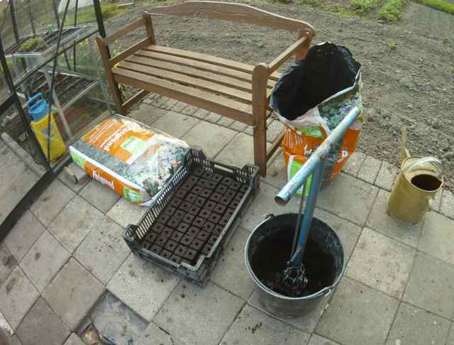 Ik gebruik daar een potjespers voor. In het filmpje hieronder kun je zien hoe dat werkt. De potjes gaan in een bak en die gaat weer terug in de kas.